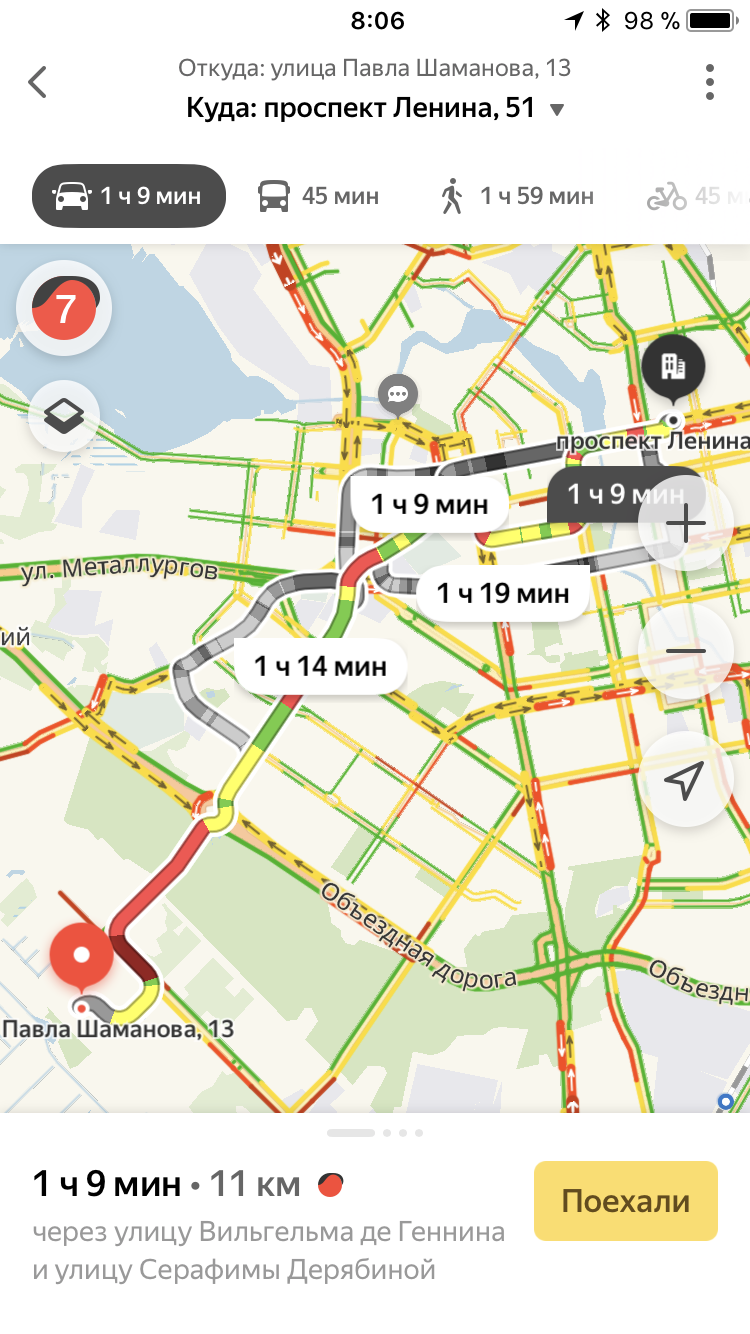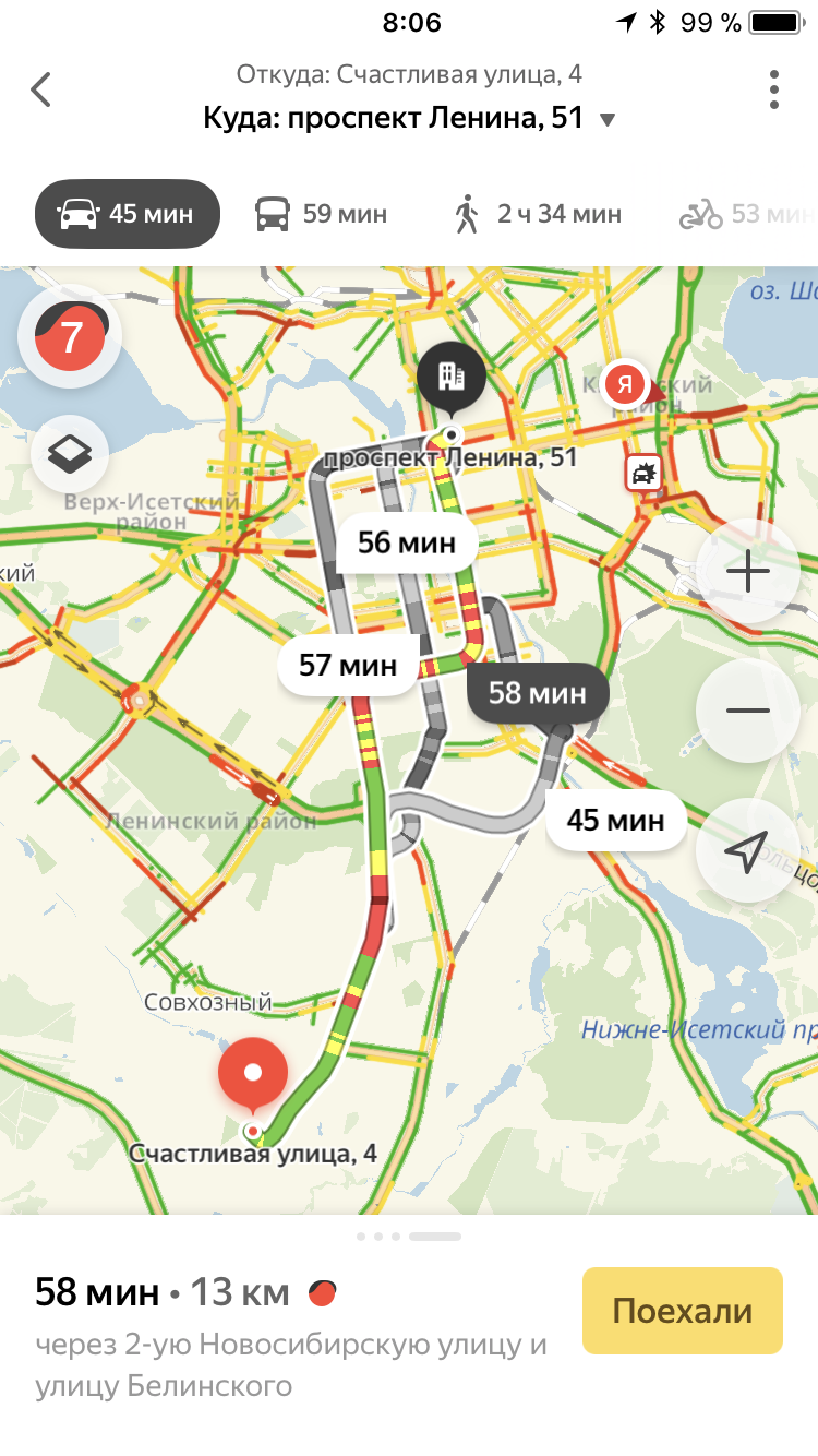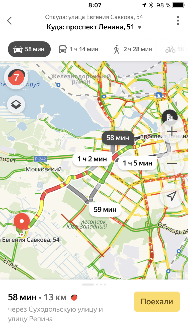 Планы планами, а жить людям надо сейчас. Поэтому стоит обратиться к сервису Яндекс.Карты. В самое пиковое время — 8:00 утра — дорога от Евгения Савкова, 54 до Ленина, 51 составляет 58 минут. Для сравнения: в это же время доехать до Ленина, 51 из Академического (Павла Шаманова, 13) — 1 час 9 минут, а из Солнечного (Счастливая, 4) те же 58 минут.