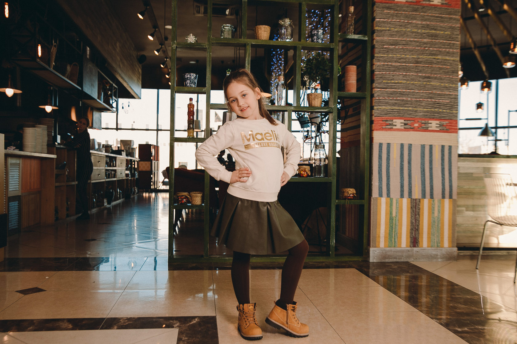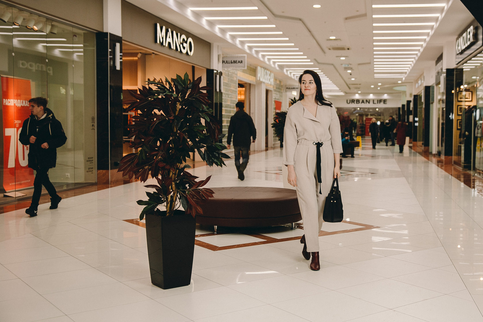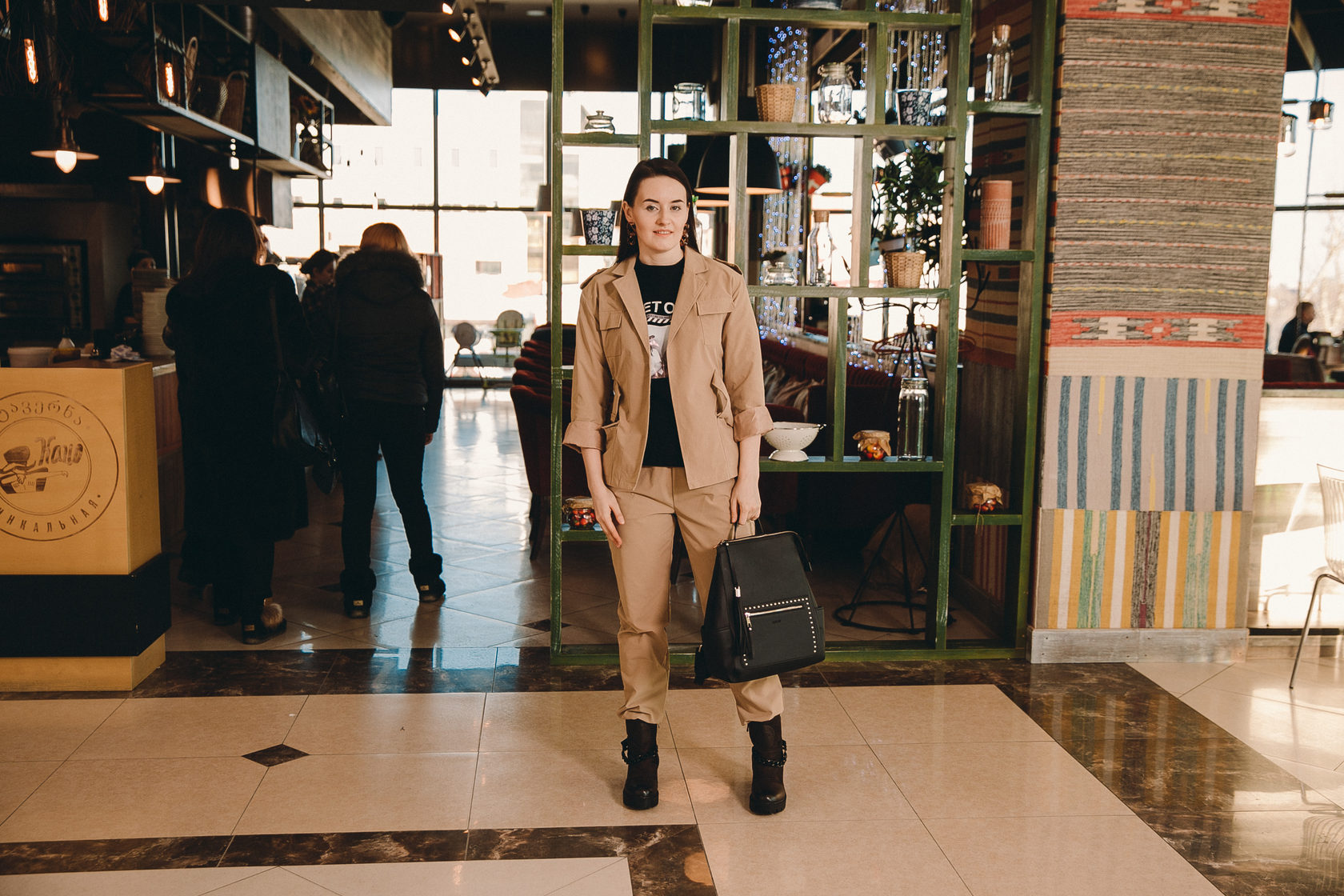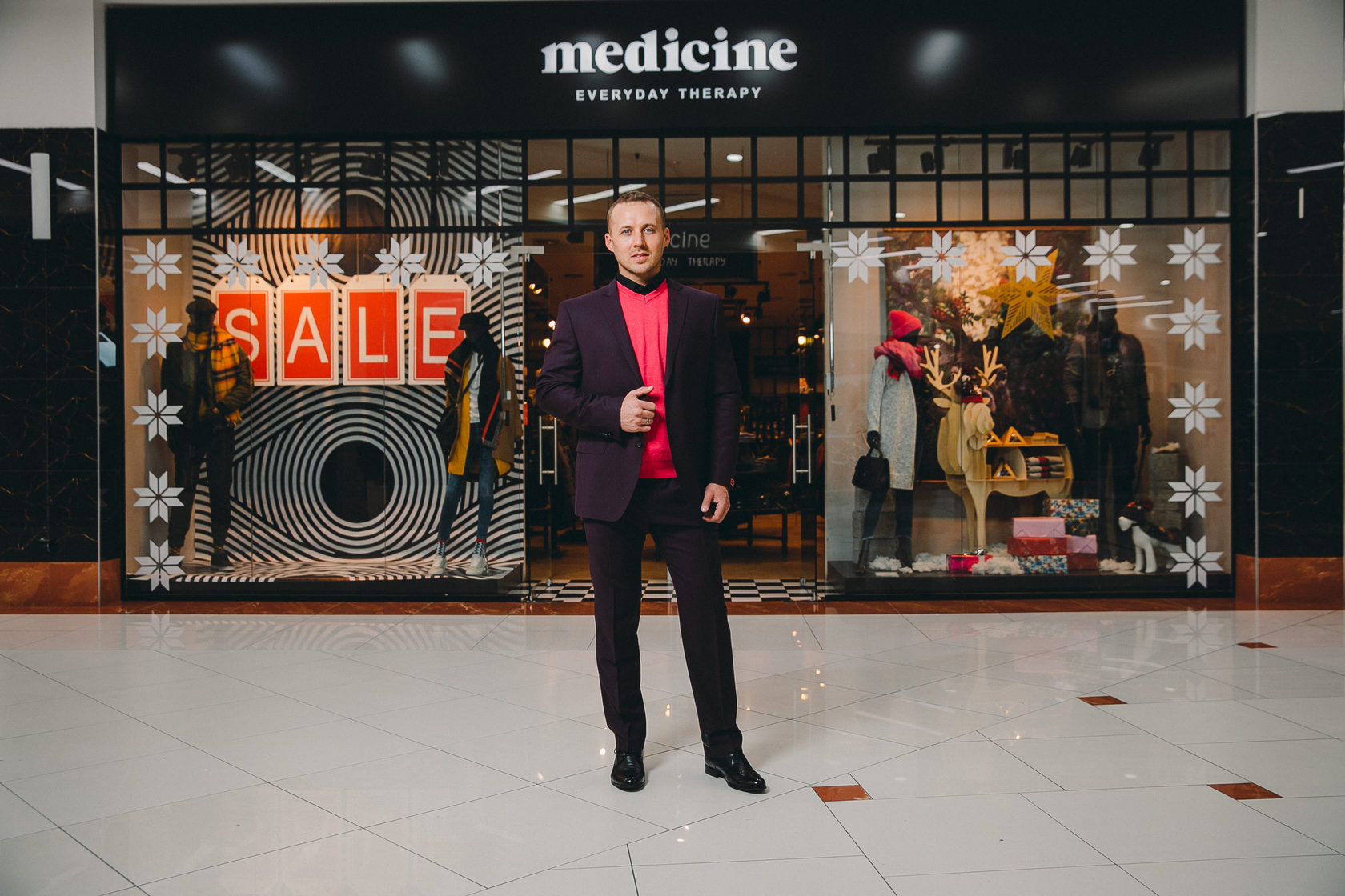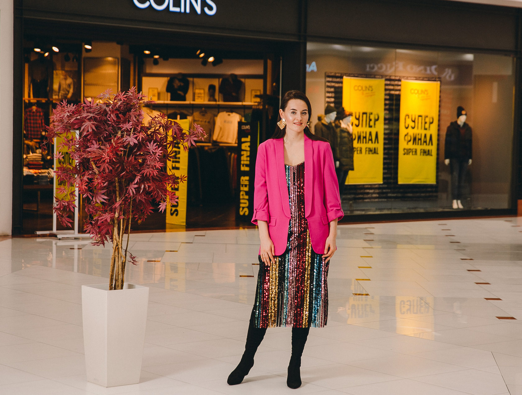 Платье Екатерины неординарно в исполнении — оно не только играет за счет переливающихся разноцветных пайеток, но также усложнено их вертикальным расположением на полочке — создается некоторая геометрическая абстракция. Не стоит бояться вычурных блестящих мотивов в одежде, эти модные приемы подходят не только для новогодних вечеринок. Просто нужно помнить правило: «спесь» с вещи нужно «сбивать» вещами-компаньонами, например, юбка в пайетках может достойно сочетаться с простой футболкой или водолазкой. Здесь такой вещью выступает жакет цвета ободряющей фуксии, он закрывает открытые руки, что актуально для зимнего сезона. Акцентные серьги всегда будут спецэффектом вашего комплекта, но важно быть аккуратней с прической и макияжем — пусть они будут поскромнее.
